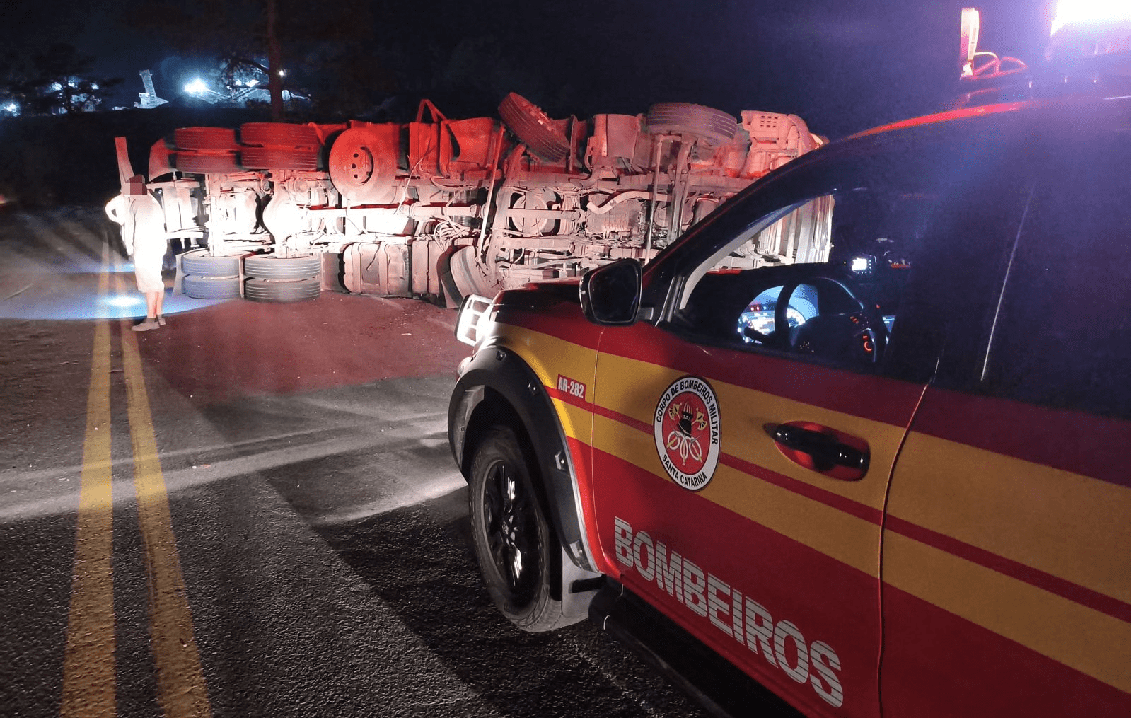 Na noite deste quarta-feira (18), ocorreu um tombamento de uma carreta com carga de madeira na BR-470 no Km 212 nas proximidades da entrada do Túnel 18 em Curitibanos.
