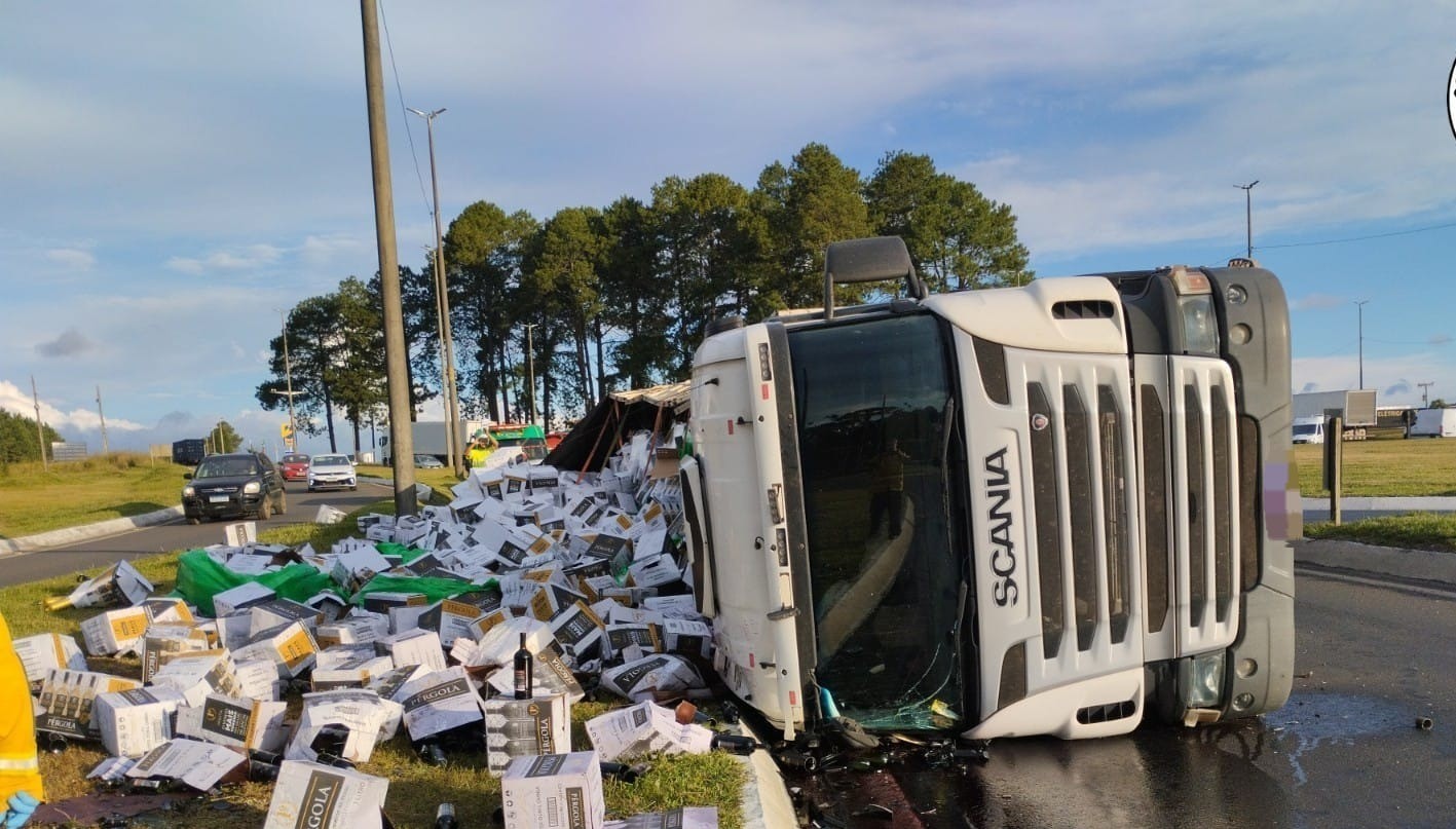Conforme os registros dos bombeiros, a carreta Scania com a placa da carreta de Flores da Cunha e do cavalinho do Mercosul estava com carga de vinhos e tombou ao fazer a curva sobre o trevo. O motorista um homem de 41 anos nada sofreu e assinou o termo de recusa de atendimento.