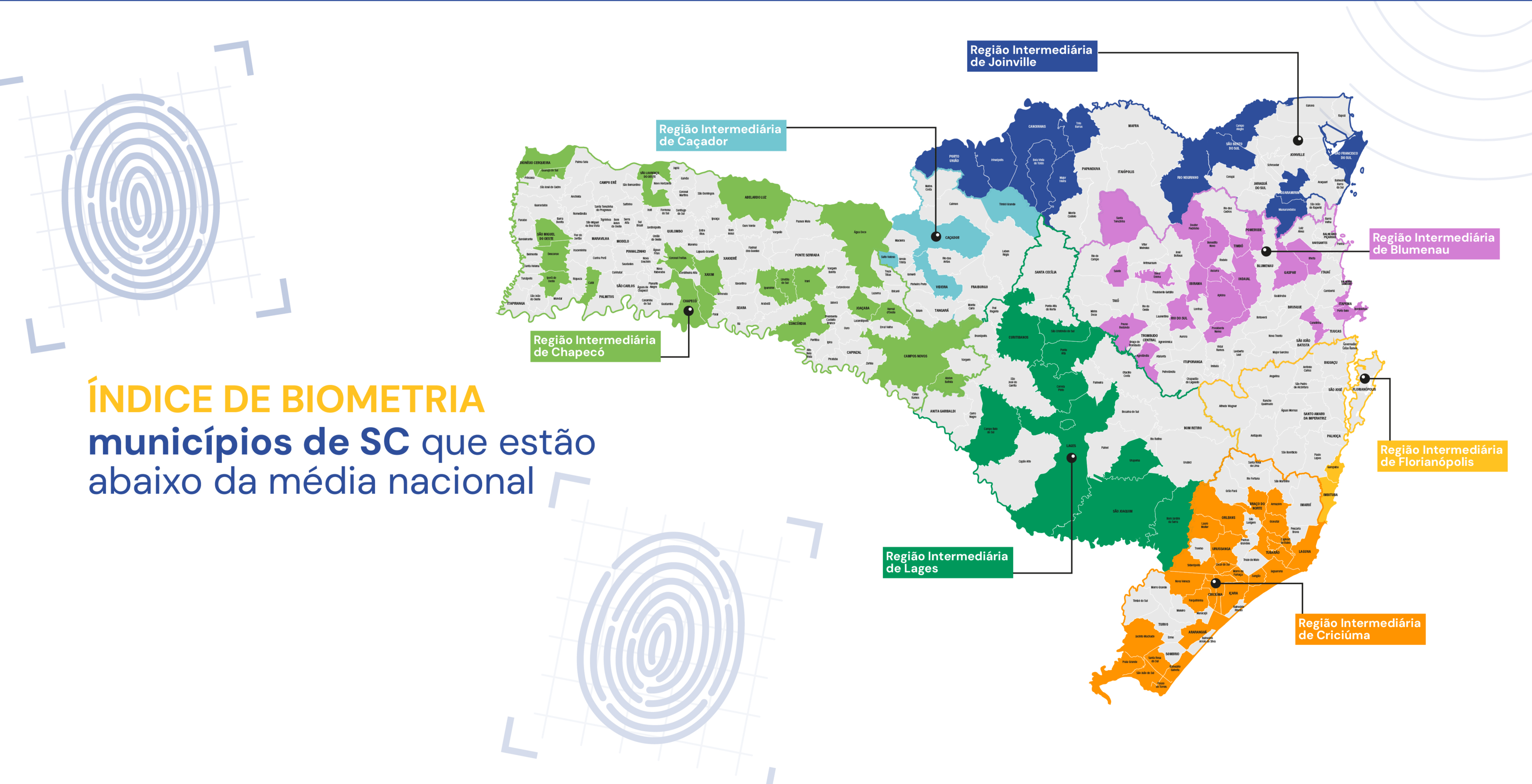 Ao olhar para os municípios catarinenses a partir da divisão de regiões intermediárias do IBGE, a intermediária de Criciúma é a que possui — percentualmente — mais municípios com índice de biometria abaixo da nacional: 59,09%. Seguida pela intermediária de Joinville (48%), de Lages (41,66%), de Blumenau (36,66%), de Caçador (25%), de Chapecó (18,34%) e de Florianópolis (11,76%).