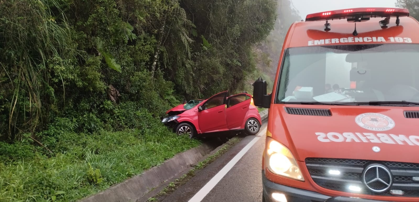 O Corpo de Bombeiros atendeu a um veículo que veio a colidir em uma rocha de grande porte que caiu sobre a pista na BR-470 no KM 205 na Serra dos Pires em São Cristóvão do Sul.