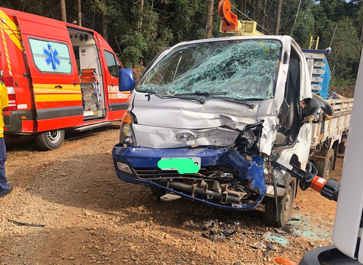 Na tarde desta quarta-feira (10), o Corpo de Bombeiros atendeu a uma colisão frontal entre um caminhão Iveco com placas de Curitibanos e uma caminhonete Hyundai HR placas de Chapecó no interior do município de Curitibanos.