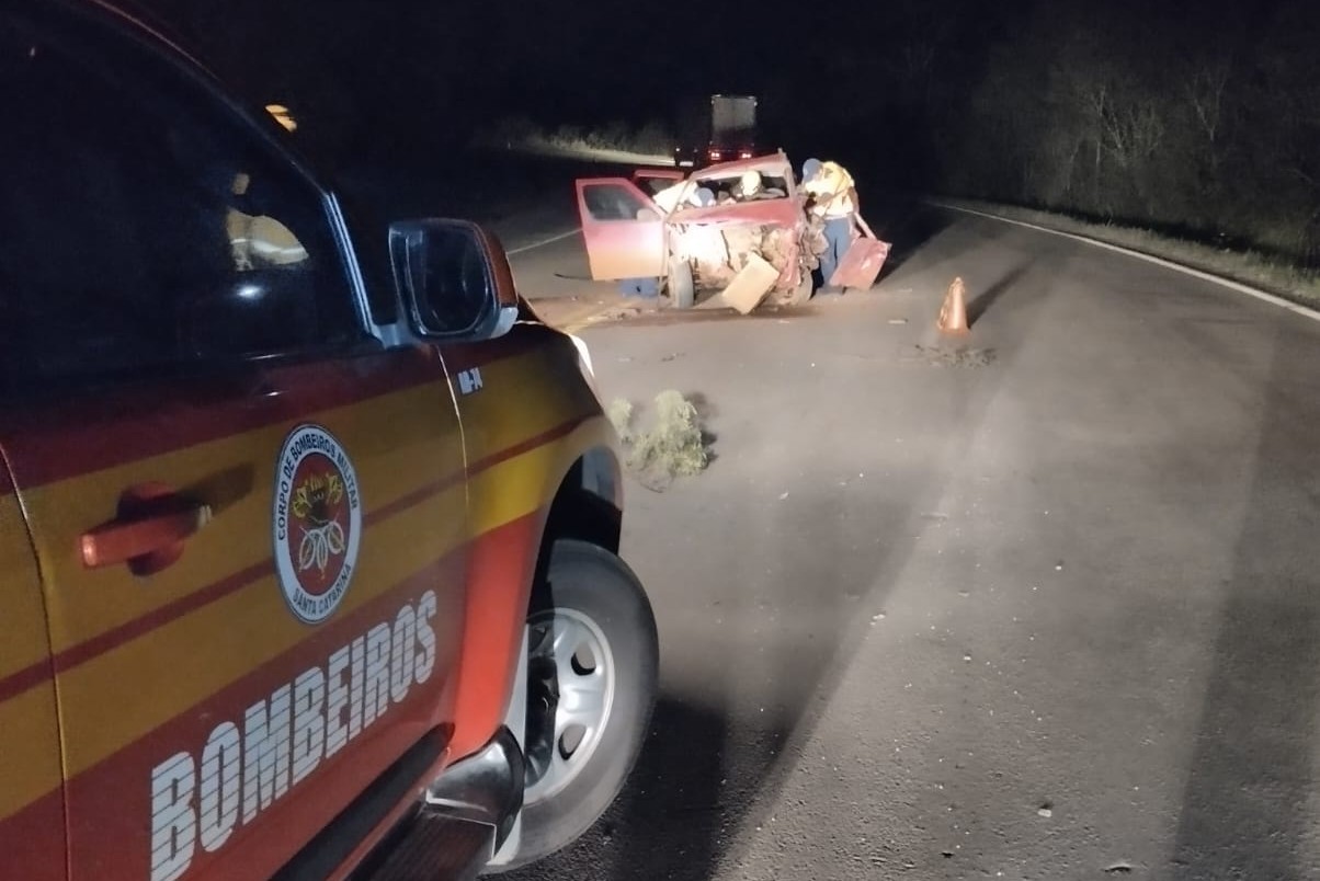 Motorista do automóvel um homem de 45 anos não resistiu e veio a óbito no local. Foto: Corpo de Bombeiros Militar de Curitibanos.