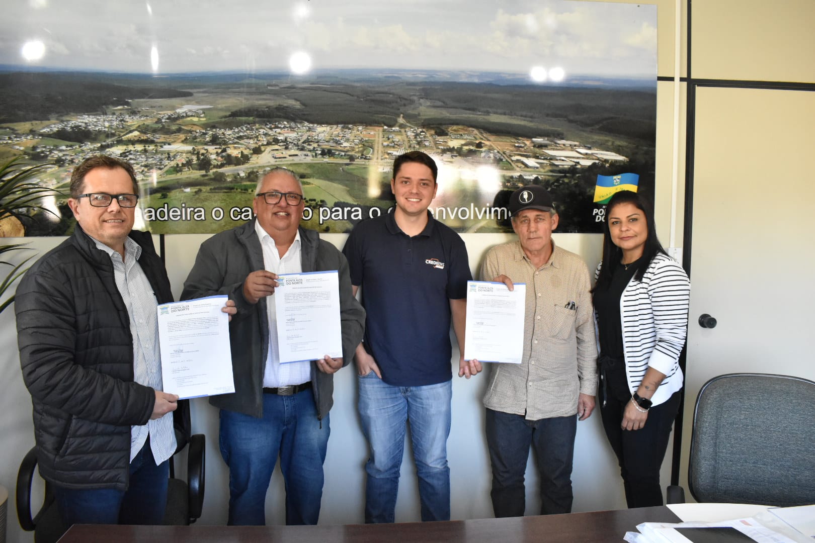 Estiveram presentes na assinatura, o Engenheiro Civil Leonardo Andrade e o Mestre de Obras Nilton Domingues da Credibens Construtora Ltda vencedora do processo licitatório.