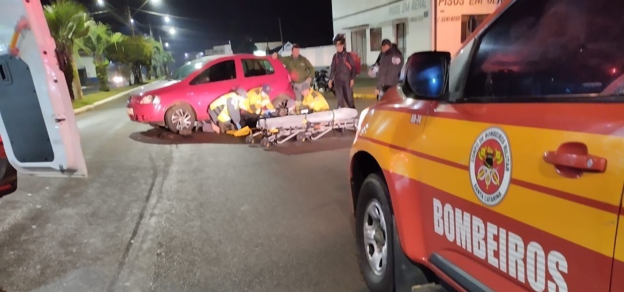 O Corpo de Bombeiros atendeu a uma colisão entre uma moto e um veículo em Curitibanos.