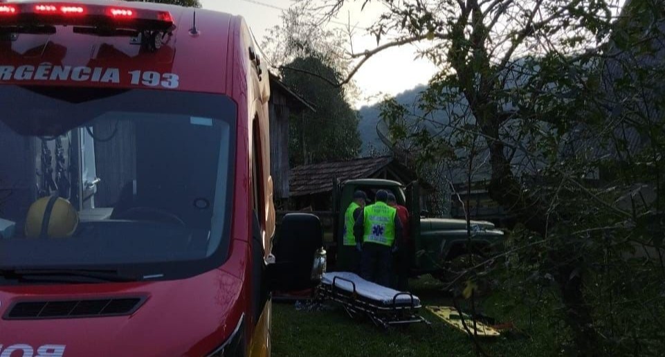 A vítima apresentava fraturas nas pernas esquerda e suspeita de lesão na cervical, sendo encaminhada até o hospital em Salto Veloso. Foto: Corpo de Bombeiros Militar de Salto Veloso.