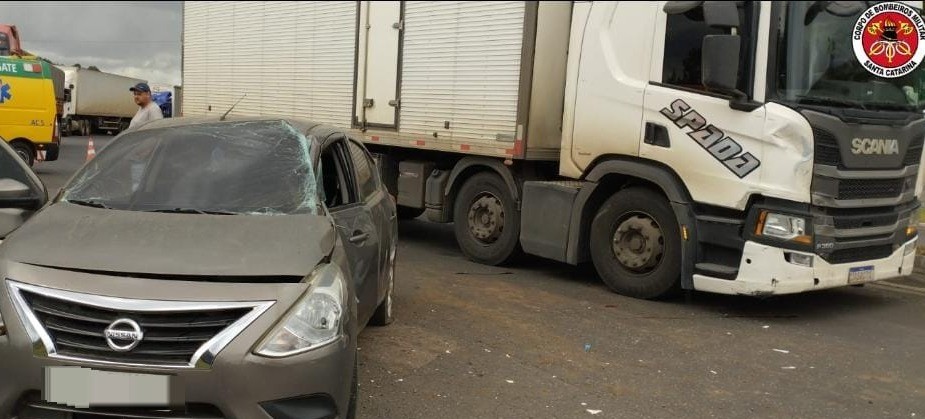 De acordo com os registros dos bombeiros, o condutor do caminhão um homem de 54 anos relatou que trafegava na rodovia e ao chegar no trevo, um veículo Versa s tinha como motorista uma mulher de 30 anos que saia da SC-350 para acessar a BR-116 quando cortou sua frente, vindo a colidir.