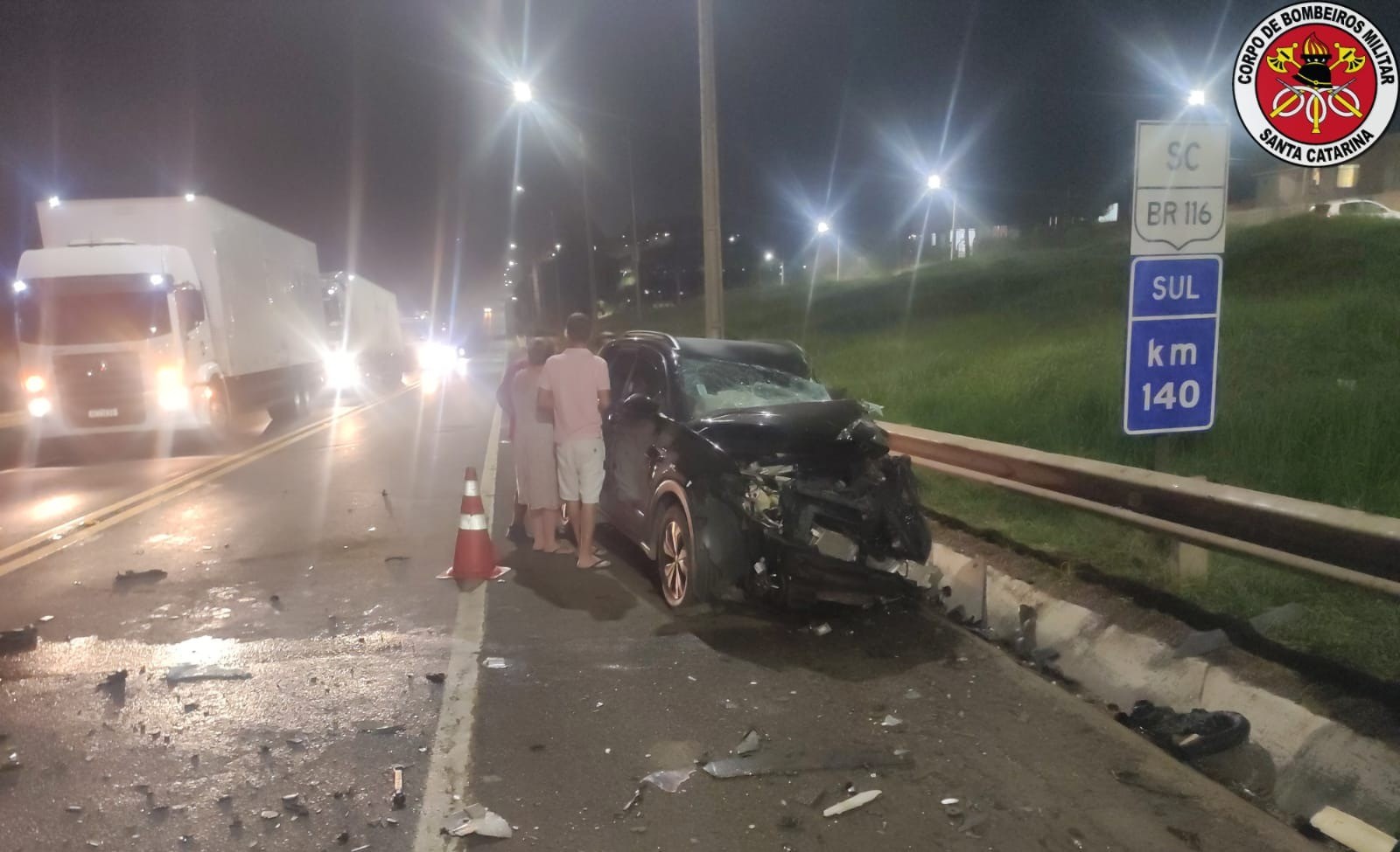 De acordo com os bombeiros, o caminhão Volvo tinha como condutor um homem, o mesmo nada sofreu e recusou atendimento e o automóvel VW T-Cross tinha como motorista uma mulher de 51 anos, a mesma estava consciente, desorientada, com suspeita de traumatismo craniano e fratura aberta na perna direita, sendo de imediato retirada a vítima do carro, atendida e encaminhada ao Pronto Atendimento do município.