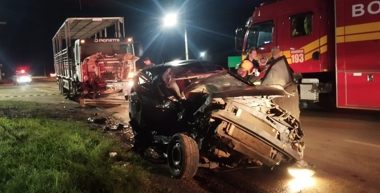O Corpo de Bombeiros atendeu a uma colisão entre um caminhão e um carro em Tangará.