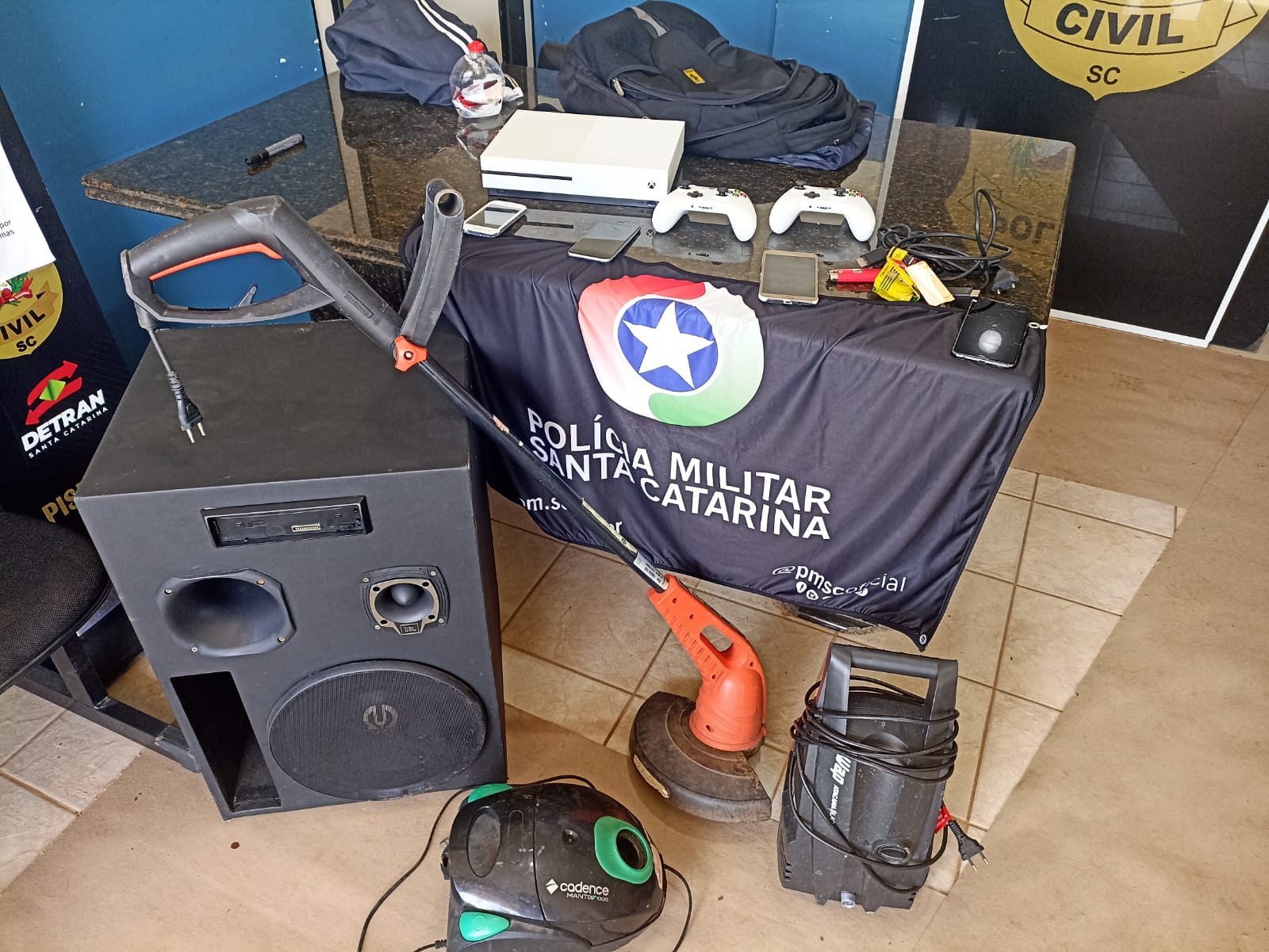 Dentro da mochila foi encontrado, quatro aparelhos celulares e um vídeo game Xbox. Ainda no mato, pelo caminho da tentativa de fuga, localizaram uma máquina de lavar de alta pressão, um cortador de gramas, um aspirador de pó e uma caixa de som.