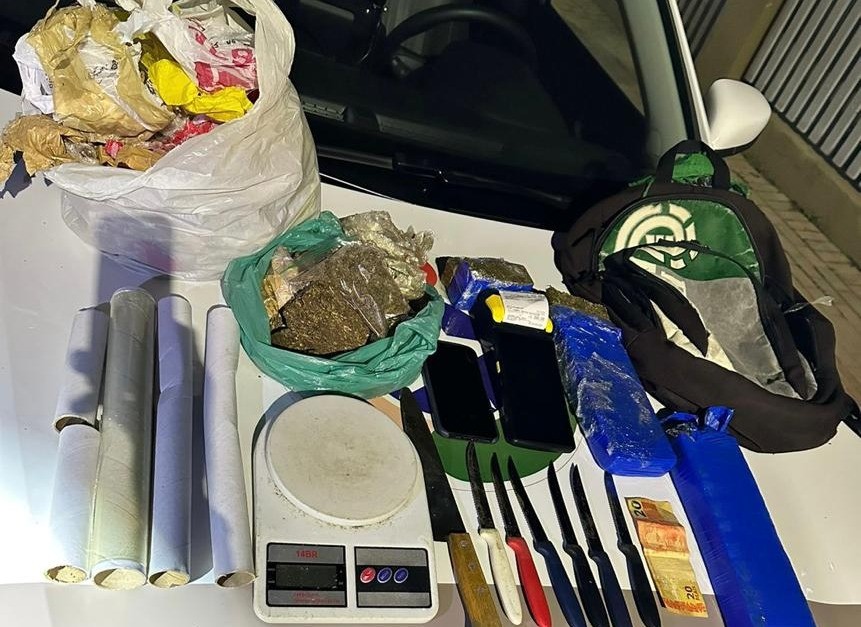 Já na residência do traficante foi apreendida mais maconha, somando 2,1 quilos, balança de precisão, rolos de plásticos utilizados para embalar a droga para venda no varejo e outros apetrechos utilizados para traficância.