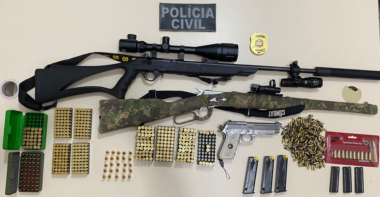 Armas e munições foram localizadas e apreendidas na residência do suspeito. Foto: Polícia Civil de Curitibanos.