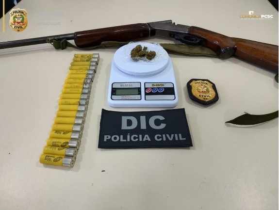 Conforme os registros da Polícia Civil, durante o cumprimento da ordem judicial, os policiais civis localizaram na residência do indivíduo uma espingarda calibre 20, 15 munições intactas, 4 estojos de cartuchos e uma porção de maconha.