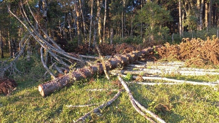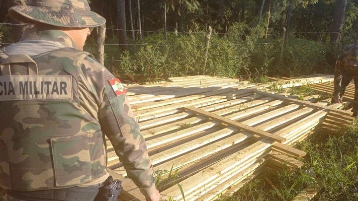Conforme a Polícia Militar Ambiental, foram apreendidos tábuas, ripas, caibros da espécie Pinheiro brasileiro (Araucária angustifólia), armazenados no campo a céu aberto no terreno da propriedade.