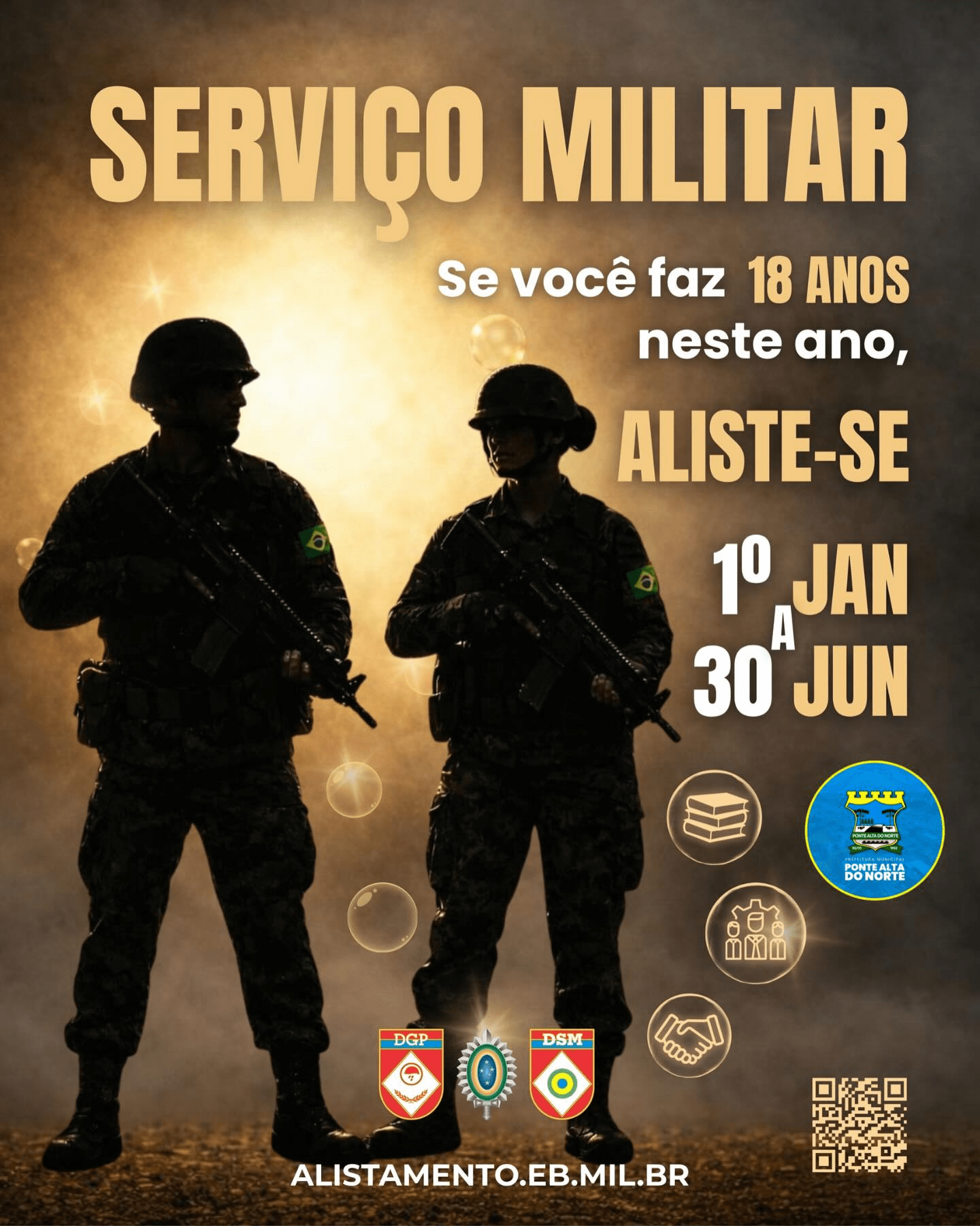 A Junta de Serviço Militar de Ponte Alta do Norte, informa que seguem abertas as inscrições para o alistamento militar obrigatório, o alistamento online é somente para quem completa 18 anos neste ano (nascidos no ano de 2008) e estará disponível até 30 de junho.
