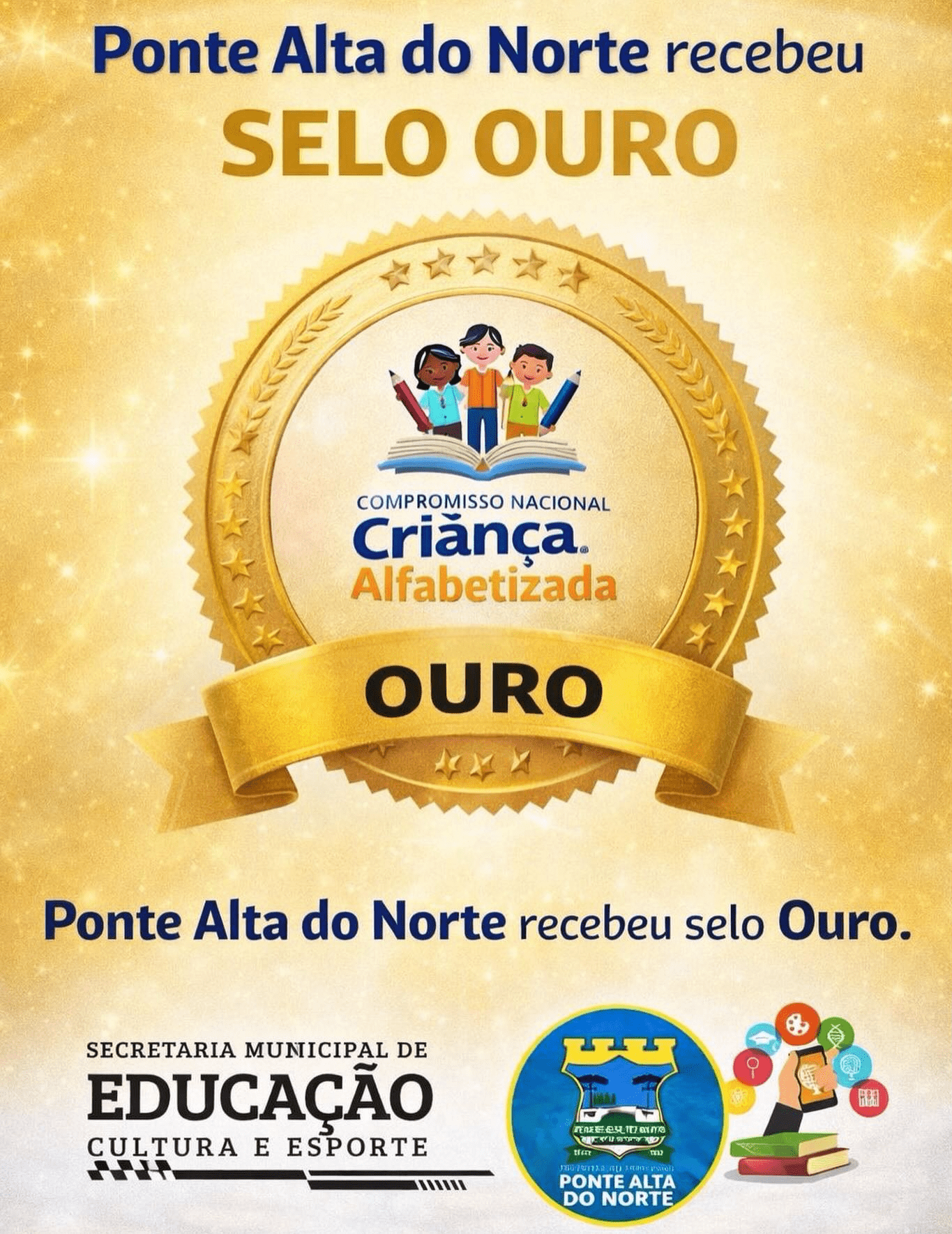 O município de Ponte Alta do Norte, em parceria com a Secretaria Municipal de Educação, Cultura e Esporte celebra um importante conquista para a educação pública o Selo Ouro do Compromisso Nacional Criança Alfabetizada, reconhecimento concedido pelo Ministério da Educação.