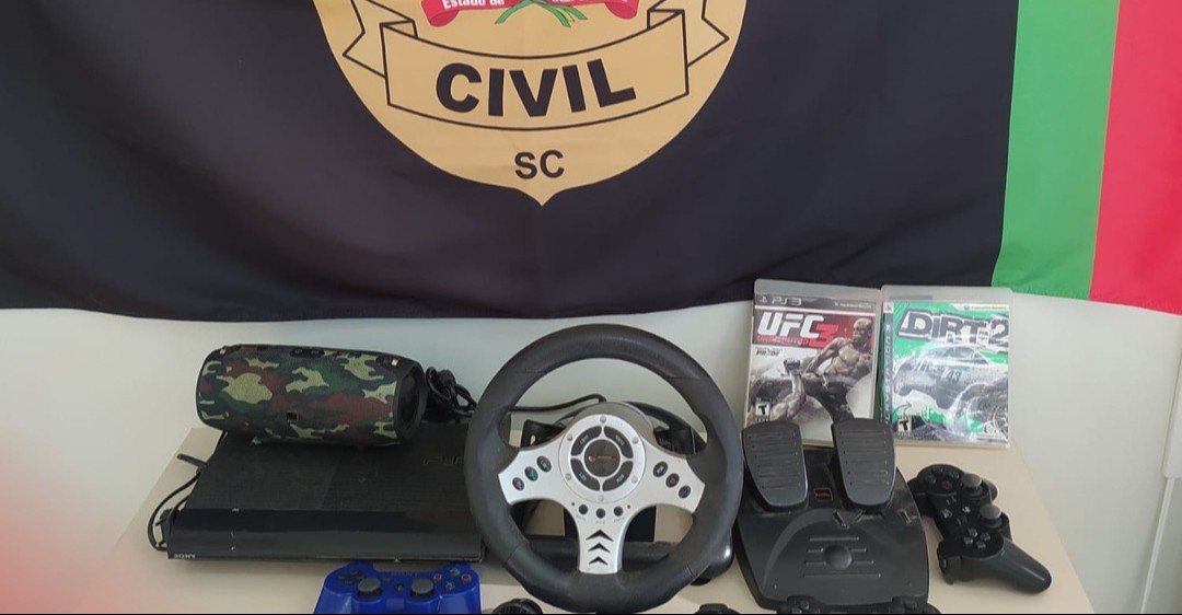 Conforme a Polícia Civil, um Video Game Playstation 3, cinco controles para vídeo game Playstation 3, um volante gamer com pedal da marca Leadership, uma caixa de som JBL na cor camuflada, um aparelho DVD marca Samsung e um TV 43 polegadas marca AOC.