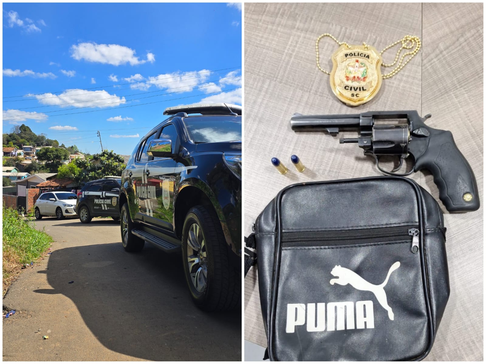 Na casa, foi apreendido um revólver marca Taurus, aparentemente calibre .38, com a numeração suprimida, além de duas munições e um estojo do mesmo calibre. Os materiais foram recolhidos e encaminhados à Polícia Científica para a realização da perícia.