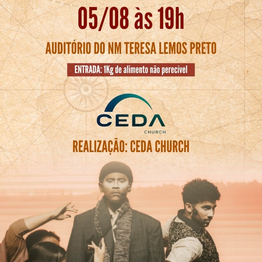 O espetáculo é promovido pela CEDA Church e serão dois dias de apresentação em Curitibanos, no sábado (05) no Núcleo Municipal Teresa Lemos Preto e no domingo (06) às 17h30, na sede da igreja que fica próximo a Escola de Educação Básica, Sólon Rosa.