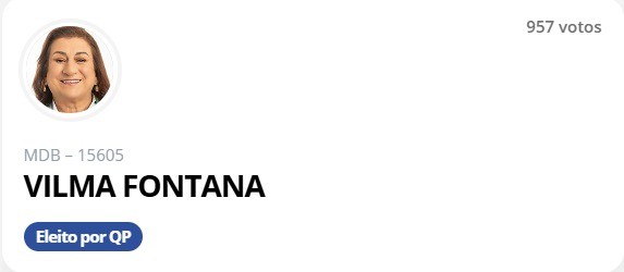 A apuração oficial do TSE encerrou às 19h49, quase uma hora após o previsto e com isso definiu também os vereadores que foram eleitos. Vilma Fontana (MDB), foi a mais votada, recebendo 957 votos.